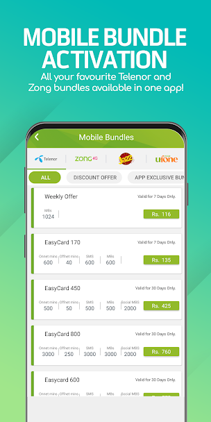 Easyload: Customers can make easyload transactions from the comfort of their homes on any of the following networks: i. Telenor a. Easyload Rs. 30 – Rs. 49 & Get 30 Free Telenor Mins, SMS & MB’s For 1 Day b. Easyload Rs. 50 – Rs. 99 & Get 60 Free Telenor Mins, SMS & MB’s For 1 Day c. Easyload Rs. 100 or Above & Get 1,000 Free Telenor Mins, SMS & MB’s For 1 Day ii. Jazz iii. Zong iv. Ufone Non-Telenor Mobile Network Users will get 25% Cashback on any Easyload amount with a maximum of Rs. 200 cash back in a given month. Money Transfer: Send money to your friends and family anywhere in Pakistan. Sending money to any CNIC, Mobile Account or a Bank Account has never been this easy. Telenor Offer Activation: All your favorite Telenor Call, SMS & Data Offers can be easily subscribed from the Easypaisa App. Not just that but also receive exclusive discounted offers. i. Telenor Internet Offers a. Weekly Ultra For Self: Get 6,000 MBs (5,000 Free Use MB’s & 1,000 Social MB’s for Goonj & Gamebox) in just Rs. 139! b. Weekly Super Offer: 2,500 MB’s (2,000 Free Use MB’s & 500 Social MB’s for Goonj & Gamebox) in just Rs. 155! c. Social Pack Offer: 50MB’s per day for Facebook, WhatsApp & Twitter in Just 1 Paisa! d. Monthly Starter Offer: Get 8,000 MB’s (4000MBs valid from 1AM to 7AM) in just Rs. 351. EASYPAISA DOWNLOAD APP |